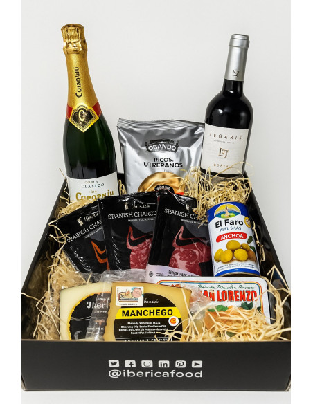 Set the scene for a perfect date night with our Tapas for Two Date Night Food Hamper. This luxurious selection brings together some of Spain's finest delicacies. Enjoy Iberico Shoulder Ham, sliced Acorn-fed Iberico Chorizo, and Iberico Salchichon for a truly indulgent experience. The hamper also features Reserva Manchego Cheese in Olive Oil and a wedge of Iberico Semi-cured Cheese, paired beautifully with Dulce de Membrillo (quince jelly) and Picos Utreranos breadsticks. For a twist, we’ve included Green Olives filled with Sweet Red Pepper. To elevate your evening, pop open a bottle of crisp Codorniue White Cava and enjoy a glass of rich Legaris Roble wine. Perfect for a romantic evening or as a special gift, this hamper brings the authentic taste of Spain to your table.